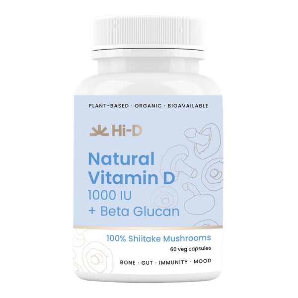 Hi-D Natural Vitamin D 1000IU + Beta Glucan is a premium wholefood supplement derived from Shiitake mushrooms, providing a natural source of vitamin D2 and beneficial beta glucans. Each capsule delivers 1000 IU of vitamin D2 and 140 mg of beta glucans in a clean, plant-based formula.