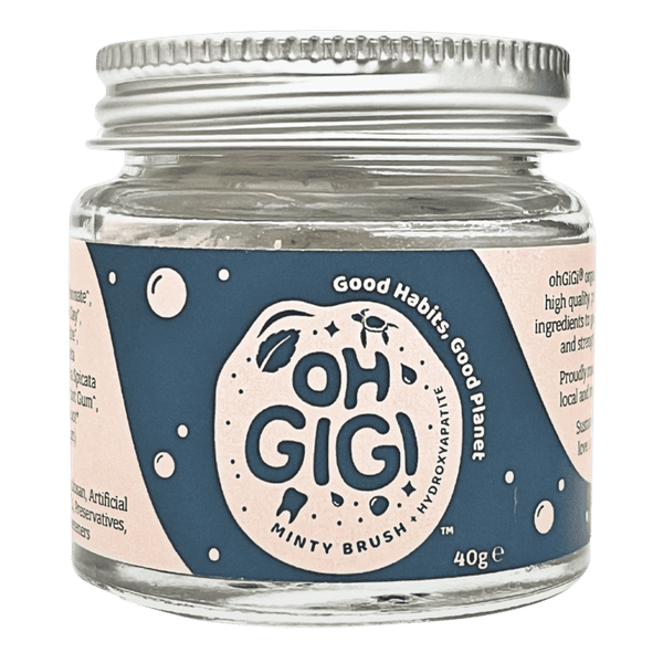 ohGiGi Minty Brush + Hydroxyapatite is a gentle oral care powder designed to support your daily dental hygiene routine. Formulated with a thoughtful blend of natural ingredients including bentonite clay, calcium carbonate, and kaolin clay, this powder offers a refreshing alternative to conventional toothpaste.